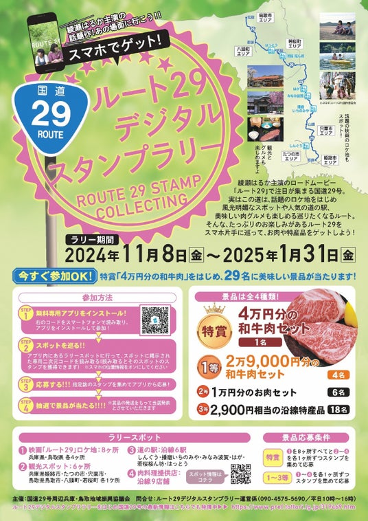 映画『ルート29』公開をきっかけに注目が高まる、兵庫県・姫路と鳥取県をつなぐ国道29号は、豊かな自然が織りなす風光明媚な景色、道の駅、美味しい肉グルメを楽しむことができる“巡りたくなる”ルートです。魅力あふれる国道29号でスマホ片手に「聖地巡礼」しながら、お肉・特産品がゲットできるデジタルスタンプラリーキャンペーンを開催します。