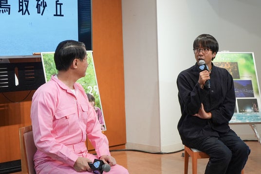 司会より作品の紹介とともに映画『ルート29』の予告編が上映されると、一気に作品の世界観に引き込まれ、取材会がスタート。司会の呼び込みとともに平井県知事と森井監督が登壇しました。主人公「トンボ」をイメージしたピンクの衣装に身を包んだ平井県知事の姿に「眼鏡までご用意いただいたんですね!」と、監督も笑顔でトークが弾みます。作品の見どころについて、監督は「登場人物だけでなく、そこにある風景も同等に扱うことで、いろんなものに溢れる美しいこの世界を描きました。鳥取県の様々な景色がたくさん詰まっています」とコメント。さらに作品の魅力とその制作舞台裏に迫るべく、鳥取県内のロケ地を示した「聖地巡礼マップ」が登場し、平井県知事と森井監督のトークセッションがスタートしました。鳥取砂丘での撮影について話題が及ぶと、「座ってのシーンだったので、砂が熱くないよう早朝に撮影したのですが、早朝の砂丘は光の入りがとってもきれいでした!」と綾瀬さんや大沢さんのエピソードも交えながら、砂丘での撮影を振り返りました。本作の撮影が鳥取県自慢の観光地「鳥取砂丘」で行われたことを受け、平井県知事は今年ハロウィンイベントが初開催されたことにも触れながら「鳥取砂丘は自然のホリゾントといわれ、行くたびに異なる姿をみせ、美しい写真がとれるんです!きっと聖地巡礼にお越しになったファンの方々もトンボやハルになりきって映画のワンシーンのような一枚が撮れます。」とその絶景をアピールしました。