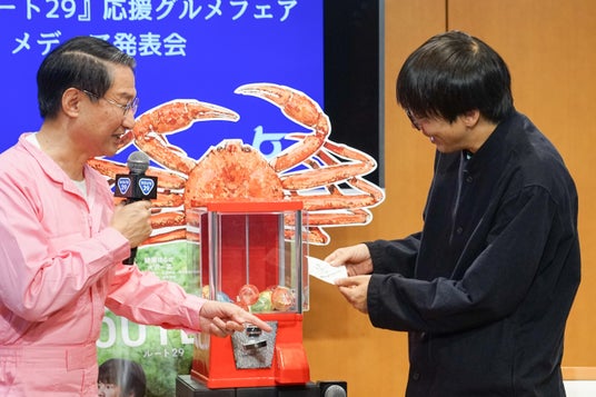 さらに、取材会当日の11月7日は「松葉がに」の初競りが行われたことを受け、1日1杯の「松葉がに」が必ず当たる「蟹カプセル」の設置が発表されました。本作のロケが7月~8月頃にかけて行われていたため、「これから鳥取に行くなら絶対食べたいもの」として旬の蟹をあげていた監督が、いざカプセルトイに挑戦。見事当たりを引き当て、平井県知事から漁解禁日に水揚げされた「松葉がに」がプレゼントされました。