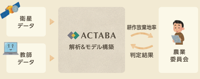 「ACTABA」は、衛星データとAIを用いて、各農地が遊休化している可能性を独自の技術で見える化する自治体向けアプリケーションサービスです。「ACTABA」の活用により、調査の負担軽減や遊休農地の早期発見を通じて、農地の有効活用・地域活性化を目指します。