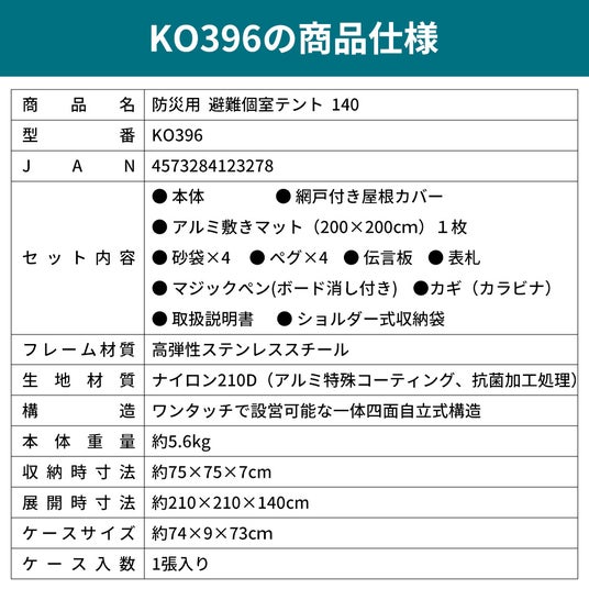 RABLISS KO395 避難個室テント180 / KO396 避難個室テント140