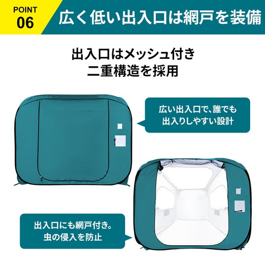 出入口横が開放でき、2つのテントでより大きな空間へと拡張が可能