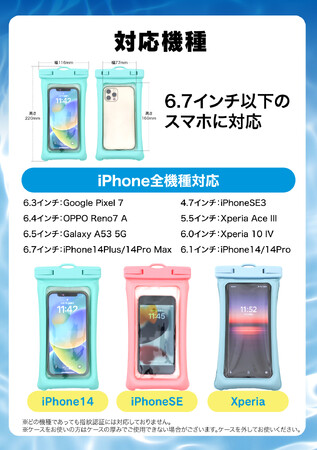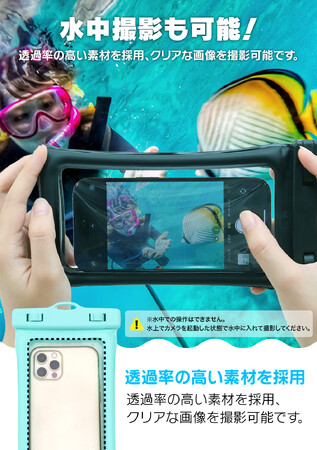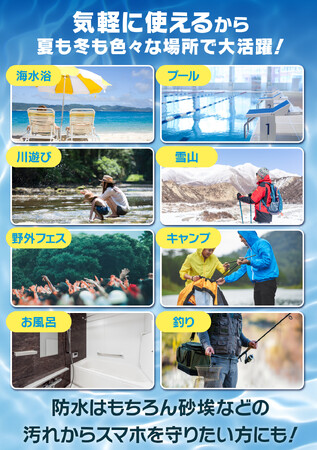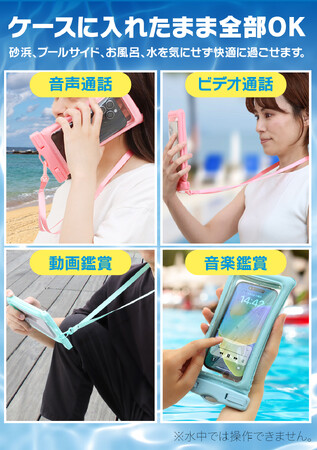海水浴、お風呂、ダイビング、川遊び、釣り、登山、キャンプ、アウトドア、野外フェス、スノボーなど活用シーンは様々。入れたまま、音声通話、ビデオ通話、動画鑑賞、音楽鑑賞、写真撮影、動画撮影なども可能です。