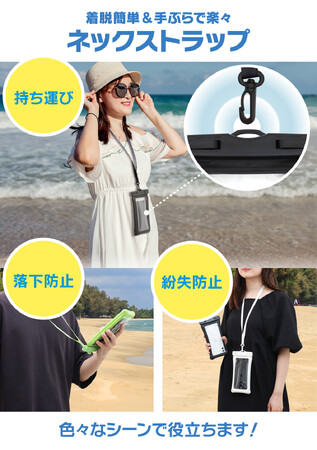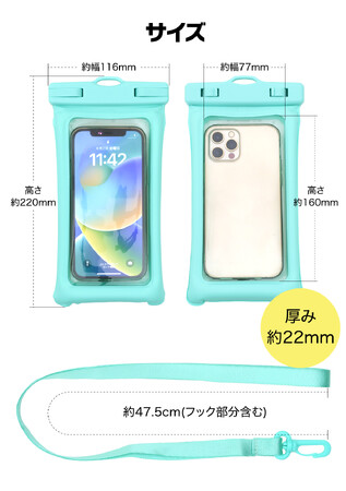 スマホを入れてクリップをパチっと閉じるだけでセット完了の防水ケースです。防水性能はIPX8、水に浮くぷかぷかエアクッション構造で、首かけ用ネックストラップも付属しています。