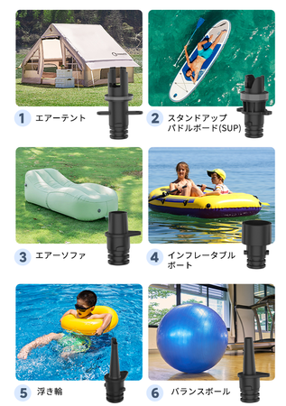 「NW02-P」は6種類のノズルを付属しており、お手持ちのほとんどの製品に対応できるので、もうアウトドアで「ポンプが合わない」と困ることはありません。