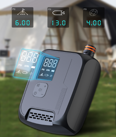 「NW02-P」には「エアーテント(6PSI)」、「スタンドアップパドルボード(13PSI)」、「浮き輪(4PSI)」といった3つのモードが予め搭載されており、モードを選んで素早く作業を開始することができます。