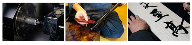 方向性が決まると、以前からのパートナー企業である溶接工場・株式会社アークリバーの川越英男さんも一緒になり、燕三条の叡智が結集された杖をつくりあげていきます。J字の持ち手のカーブは3人がかり。人が温度計を持って、一人がバーナーで金属を熱して、一人が力を加えて時間をかけて曲げていきます。本体の絶妙な形状は、切削工場の有限会社渡明製作所と相談をしながら調整し、精度を出しました。杖の形ができたら、伝統工芸士である山田仏壇・山田貴之さんへ。耐久性を持たせるため4回の漆を塗り、金・銀の装飾を施して完成です。最後に、商品の桐箱に三条市の書家・佐藤瑞雲先生によって商品名がしたためられます。