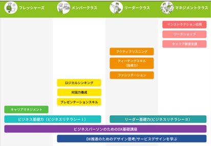 自己表現から始めて1対1のヒアリング、指導やファシリテーションなどキャリアや階層に合わせて学べる講座を段階的に用意しています。