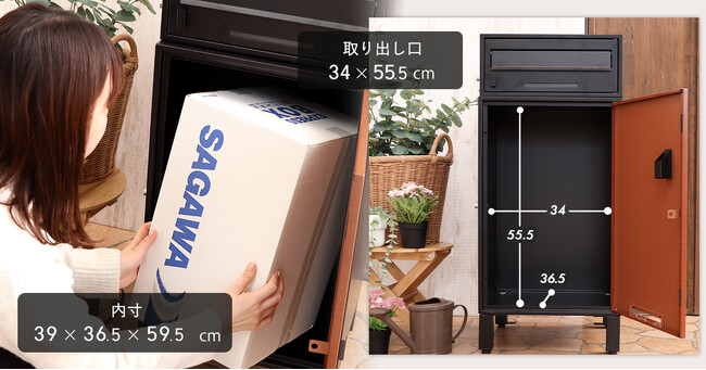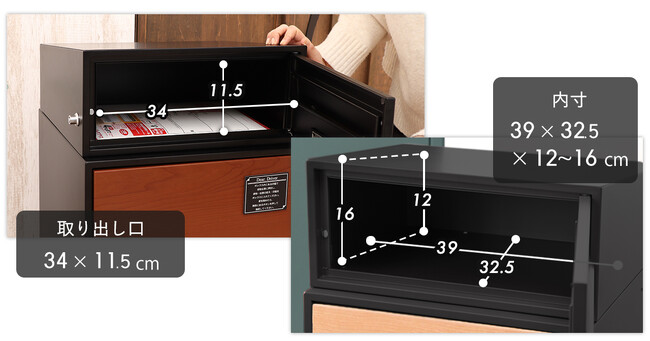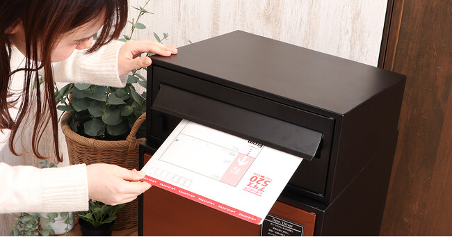 上を見上げているかのような斜め天井がスタイリッシュ。扉は住まいに溶け込む木目調のデザインとなっており、エクステリアの一部としても楽しめます。工事不要の据え置きタイプでお届け後すぐに使えることも魅力。盗難防止用に付属のアンカーボルトで固定もできる親切設計。宅配便の荷物だけではなく、郵便物や新聞を一緒に受け取ることが出来る2WAYタイプ。ポスト部分の開口部は広く、A4サイズがスッとはいります。カタログやレターパック、また回覧板の受け取りも安心です。