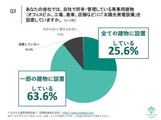 「Q3. Q2で「該当する」と回答した方にお聞きします。あなたの会社では、自社で所有・管理している事業用建物(オフィスビル、工場、倉庫、店舗など)に「太陽光発電設備」を設置していますか。」(n=195)と質問したところ、「全ての建物に設置している」が25.6%、「一部の建物に設置している」が63.6%という回答になりました。