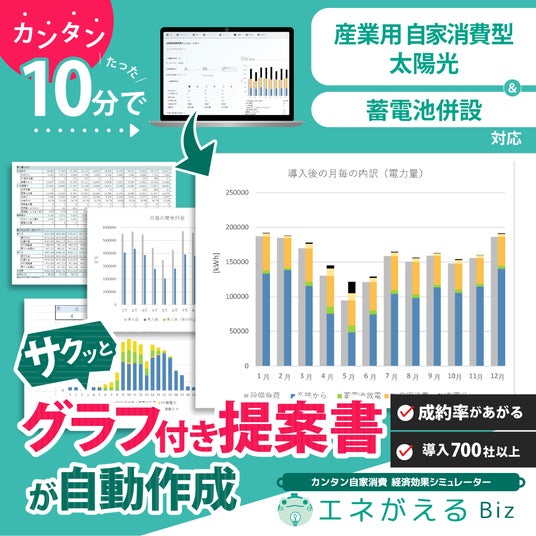 エネがえるBizは、産業用自家消費型太陽光発電システム導入の提案を迅速かつ正確に最適化するサービスです。デマンドデータを入力するだけで、投資対効果や回収期間の詳細なレポートを短期間で提供し、初期段階でも具体的な数値を迅速に提示できます。