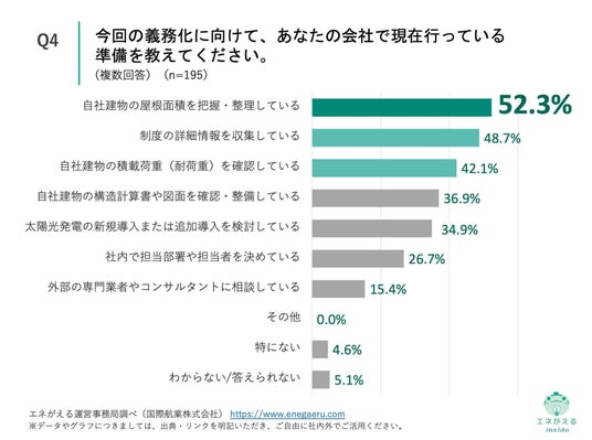 「Q4. Q2で「該当する」と回答した方にお聞きします。今回の義務化に向けて、あなたの会社で現在行っている準備を教えてください。(複数回答)」(n=195)と質問したところ、「自社建物の屋根面積を把握・整理している」が52.3%、「制度の詳細情報を収集している」が48.7%、「自社建物の積載荷重(耐荷重)を確認している」が42.1%という回答になりました。
