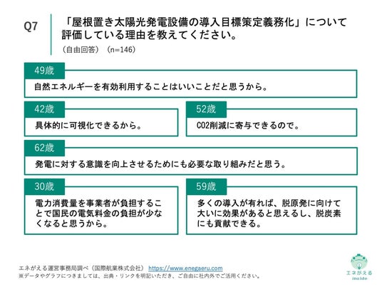 Q7.Q6で「非常に良い取り組みだと思う」「やや良い取り組みだと思う」と回答した方にお聞きします。「屋根置き太陽光発電設備の導入目標策定義務化」について評価している理由を教えてください。(自由回答)