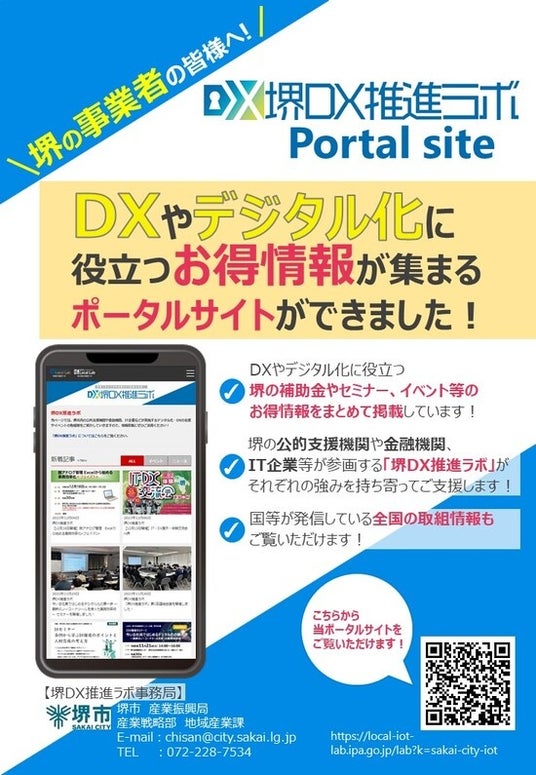 堺の事業者の方向けに、ラボ参画機関が実施するDXやデジタル化に役立つ補助金やセミナー等のお得情報が集まるポータルサイトを公表しておりますので、ぜひ情報収集にご活用ください。