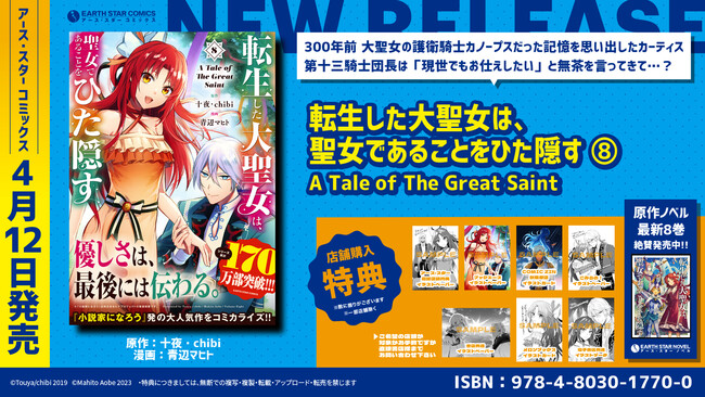 アース・スターノベルで刊行中のノベルが原作で、現在コミック アース・スターで掲載中の人気作品『転生した大聖女は、聖女であることをひた隠す A Tale of The Great Saint』(原作:十夜・chibi 漫画:青辺マヒト)第8巻を4月12日(水)に発売いたします。
