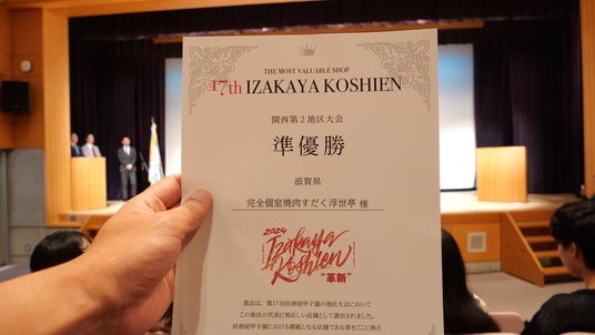 株式会社総合近江牛商社(本社:滋賀県守山市/代表取締役社長:西野 立寛)が運営する「完全個室焼肉すだく浮世亭」が NPO法人居酒屋甲子園の実施する「第17回 居酒屋甲子園 地区大会」にて準優勝を獲得しました。