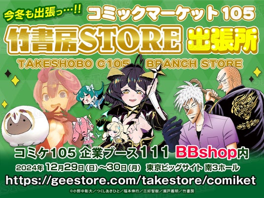 株式会社竹書房(所在地:東京都千代田区、代表取締役社長:宮田 純孝)は、2024年12月29日(日)~30日(月)開催のコミックマーケット105・BBshop内にて「C105竹書房STORE出張所」を出展いたします。