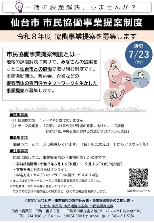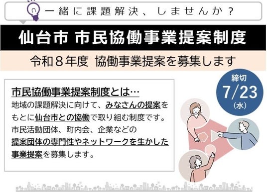 仙台市では、地域の身近な課題の解決に向けて、市民の皆さんからの提案をもとに市との協働で取り組む「仙台市市民協働事業提案制度」の提案を募集しています
