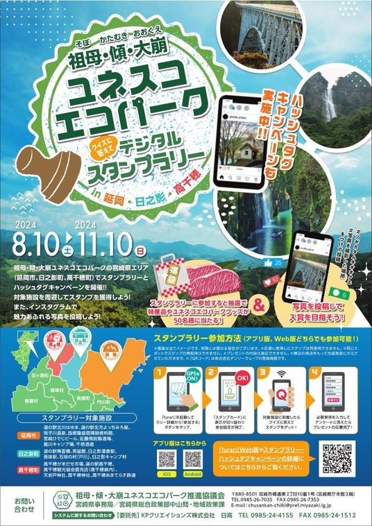 祖母・傾・大崩ユネスコエコパークの宮崎県エリア(延岡市、高千穂町、日之影町)において、道の駅や温泉等を周遊するスタンプラリーとインスタグラムハッシュタグキャンペーンを開催します!