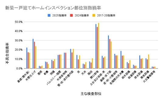 総じて、床下・屋根裏などの見えにくい部分や構造面および防水に関する箇所の指摘率が上昇しています。