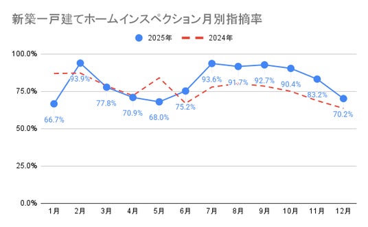 2025年の月別の不具合指摘率の推移を見てみると、7月から11月にかけて高位で推移していることがわかります。仮説ですが、7月は2025年4月の建築基準法改正後に建築確認を受けた住宅が竣工し始めたタイミングと重なることから、建築確認申請のプロセスの変化や審査の長期化などが少なからず影響している可能性が考えられます。