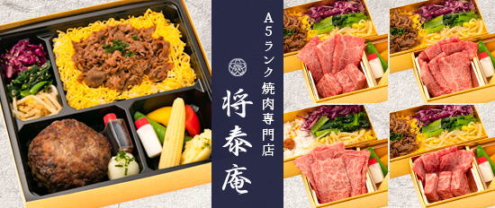 2011年6月に「肉の匠 将泰庵」船橋本店をオープンし、千葉県に11店舗、東京に5店舗、海外に3店舗を展開。その時期に一番良い状態のA5ランク黒毛和牛を厳選し、お客様に提供しています。将泰庵ならではのお弁当を、懇親会やお祝いの席、ハレの日など、様々なシーンでお楽しみください。