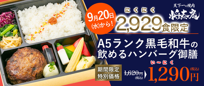 国内最大級の法人向けフードデリバリーサービス「くるめし弁当」(運営:株式会社くるめし、本社:東京都渋谷区、代表取締役:石川 聡)と「飲めるハンバーグ」の名店として各種メディアにも取り上げられる「将泰庵」は、同店の人気商品である「A5ランク黒毛和牛の飲めるハンバーグ御膳」を2023年9月20日から特別価格 1,290(=い~にく)円で販売します。天下一の焼肉(にく=29)将泰庵にちなみ、2,929食限定販売となります。