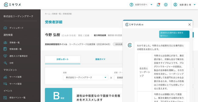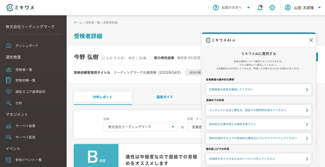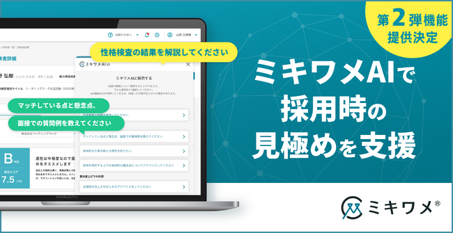 ミキワメAIを搭載した機能の第二弾として、「ミキワメ 適性検査」における性格検査の個人の結果を、AIが詳細に解説してくれる機能をリリースします。従来は性格検査の結果の解釈に知識が必要でしたが、ミキワメAIが性格検査の解釈をサポートしてくれるため、より採用時の見極めへの活用がしやすくなります。