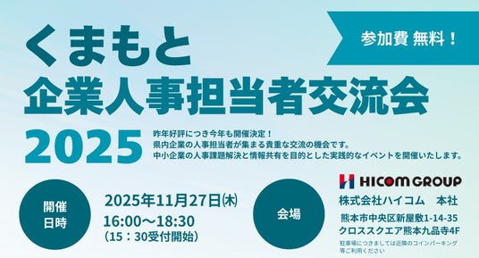 インタラクティブ株式会社(本社:沖縄県宜野湾市、代表取締役社長:臼井 隆秀、以下「インタラクティブ」)が運営する熊本に特化した双方向な求人マッチングサービス「ジョブアンテナ熊本」は、2025年11月27日(木)に「くまもと企業人事担当者交流会2025」を開催します。
