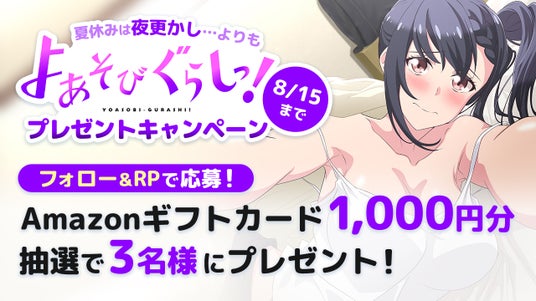 現在好評配信中の『よあそびぐらしっ!』を祝し、夏休みをもっと楽しく過ごしていただくためにプレゼントキャンペーンを開催いたします!AnimeFestaの公式Xアカウントをフォローし、指定のポストをリポストしていただくことで誰でも簡単に参加できます。