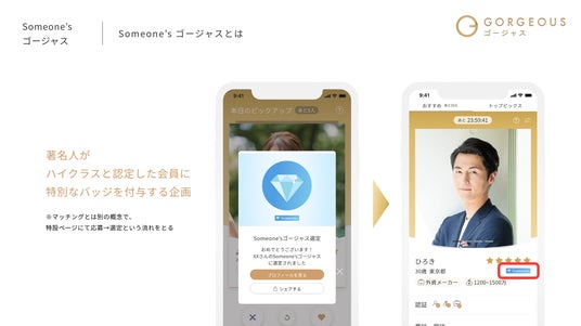 アイザック株式会社(本社:東京都渋谷区、代表取締役社長:田中和希)が運営する審査制恋活・婚活マッチングアプリ「ゴージャス」は、著名人がハイクラスと認定した会員に特別なバッジを付与する企画「Someone'sゴージャス」の第六弾を実施します。