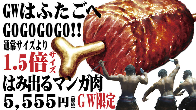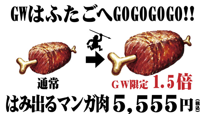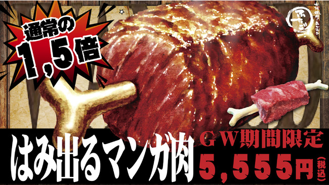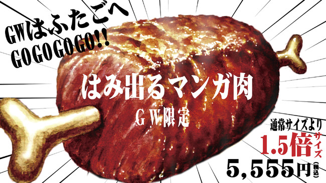 「大阪焼肉・ホルモン ふたご」を世界展開する株式会社FTG Company(本社:東京都目黒区、代表取締役社長:李 純哲)は、昨年9月より店舗限定でふたご史上最重量の500gの“はみ出る”マンガ肉を販売しており、見た目のインパクトと味で想像以上の人気メニューとなりました。そしてこの度、2022年4月29日(金)~5月8日(日)のGW期間限定で特別に1.5倍の750gに増量し、東京・大阪・名古屋の17店舗限定で販売を開始します