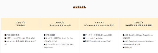 学習内容は、AWSの基本概念、インフラ設計、セキュリティなど、実務に直結するスキルを幅広くカバー。生徒一人ひとりに担任がつく個別指導で、未経験でも安心して学習を進められます。さらに、手厚い転職支援で、短期間でクラウドエンジニアとしてのキャリアを実現します。
