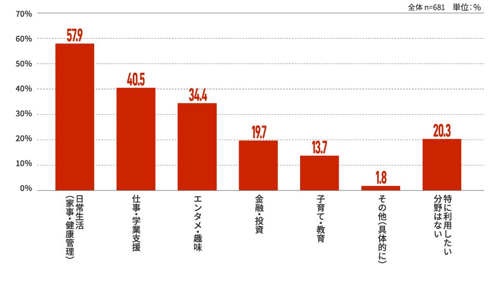 最も多い回答は「日常生活(家事・健康管理)」57.9%でした。次いで「仕事・学業支援」(40.5%)、「エンタメ・趣味」(34.4%)が続きます。「特に利用したい分野はない」は2割にとどまり、多くの生活者が“これからの生活にAIを取り入れる余地がある”と感じていることがわかりました。