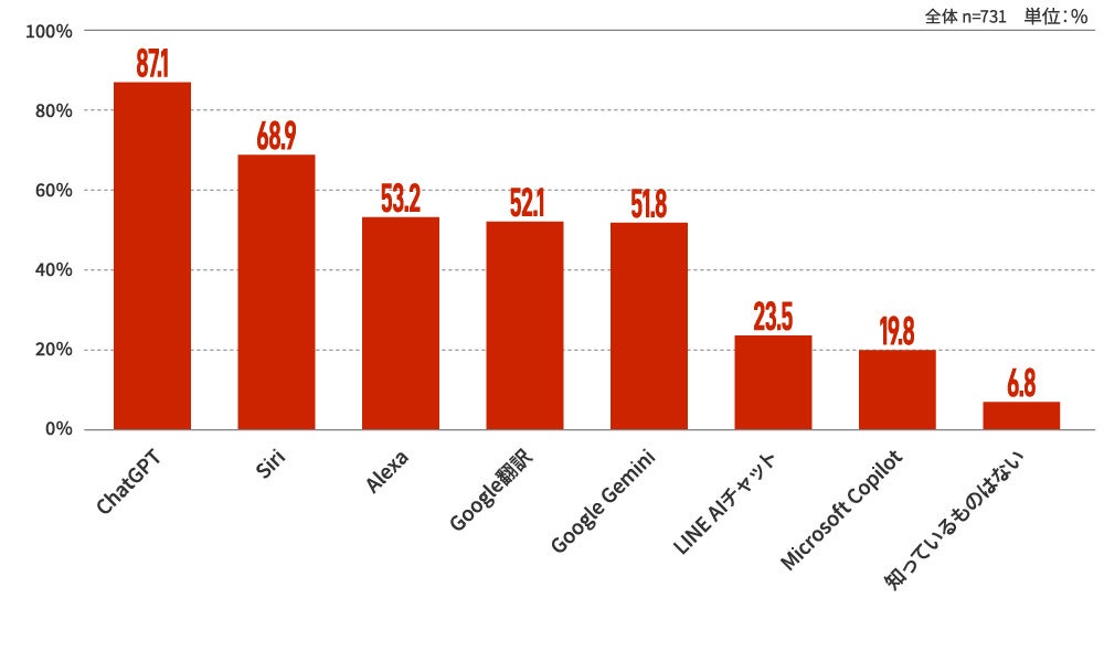 ChatGPT(68%)を中心に利用するものの、「知っているものはない」が19%と高く、AI認知はまだ浸透途上です。