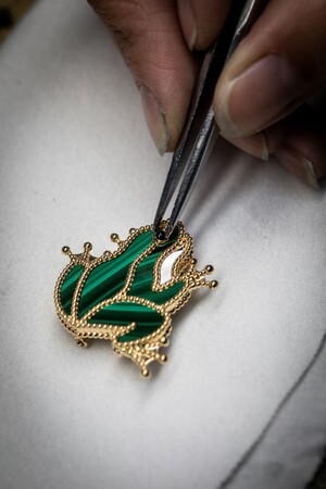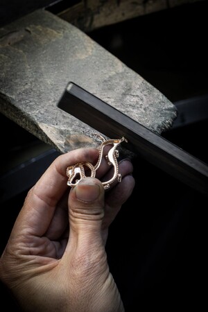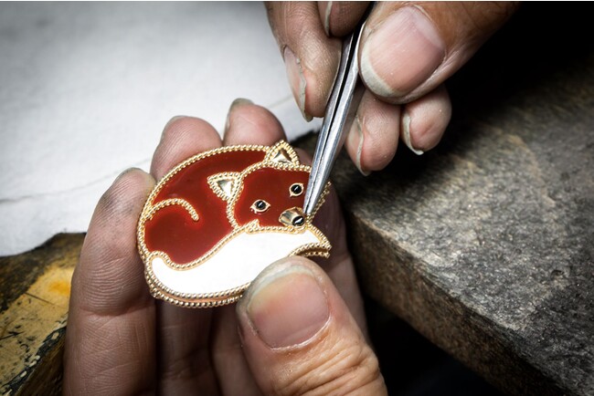 メゾンの卓越したサヴォアフェールは、創作のあらゆるプロセスに求められる正確で緻密な作業を通して輝きを放ちます。各パーツが小さいため、ストーンとマザーオブパールのカットや作品の研磨には、細心の注意を要します。動物たちのシルエットを縁取る細かいゴールドビーズは、ひとつひとつ手作業で磨かれ、作品に高貴な煌めきのタッチを添えます。新作クリップでは、艶やかに磨き上げられたゴールドが脚や耳、鼻口部にあしらわれ、動物たちに輝くばかりの生命感を授けています。