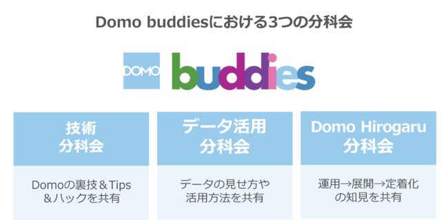 日本独自のコミュニティ活動として、Domo buddiesが主体となりテーマごとに組成された分科会がDomoの技術力向上と活用推進のため、定期的に勉強会を実施しています。具体的には、「技術分科会」、「データ活用分科会」、「Domo Hirogaru 分科会」の3つのテーマに沿った分科会が毎月順番で勉強会を主催し、Domoの上手な活用法やデータ活用のコツなどをお互いに共有しながら、スキルアップと共に新しいビジネスの発想に繋げています。
