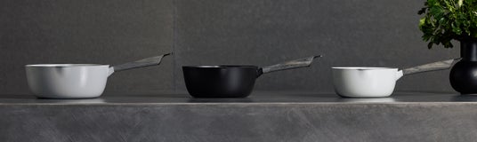 従来の雪平鍋のイメージを覆す、繊細で美しい造形にこだわりました。用途に合わせて選べる3サイズをご用意し、上質でモダンな3色のカラー展開。強度と美しさが両立するウッドハンドルには、バーミキュラ初のライトグレーを採用。 カラー展開:マットブラック、シーソルトホワイト、オイスターグレー サイズ展開:16cm ¥17,300, 18cm ¥18,300, 20cm ¥19,300