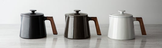 スープポットは、直径11.8cm、容量1.9Lのワンサイズ。1~2人分の調理におすすめです。鋳物ホーローとウッドが組み合わさったスタイリッシュな佇まいは、どんなキッチンにも馴染みます。コンパクトで収納にも困りません。カラー展開:マットブラック、シーソルトホワイト、トリュフグレー ¥26,180