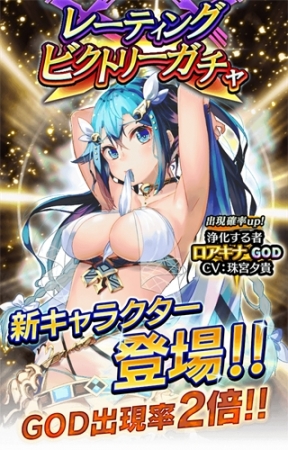 強力な能力を備えた新GODキャラクター「【浄化する者】ロアキナ」(CV:珠宮夕貴さん、イラスト:sarakiさん)、および新GODアクセサリ「【風信子石の宝石獣】ジルコン」が登場した、「レーティングビクトリーガチャ」を開催中です。当ガチャでは、最高レアリティのGOD出現率が2倍に上昇しており、さらに新GODキャラクターおよび新GODアクセサリの出現率がアップしています。9月度より報酬が大幅にパワーアップした「レーティングバトル」の開始を記念した、強力な新GODを狙いやすい特別なガチャとなっておりますので、お見逃しの無きようご利用ください。