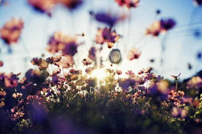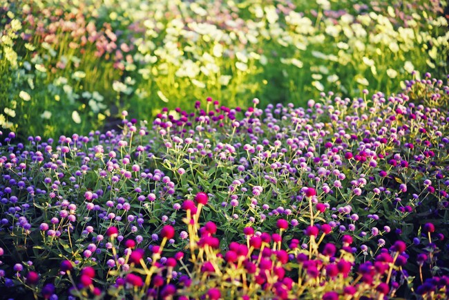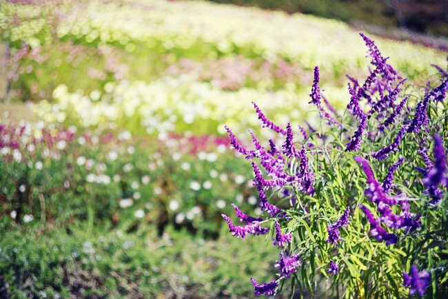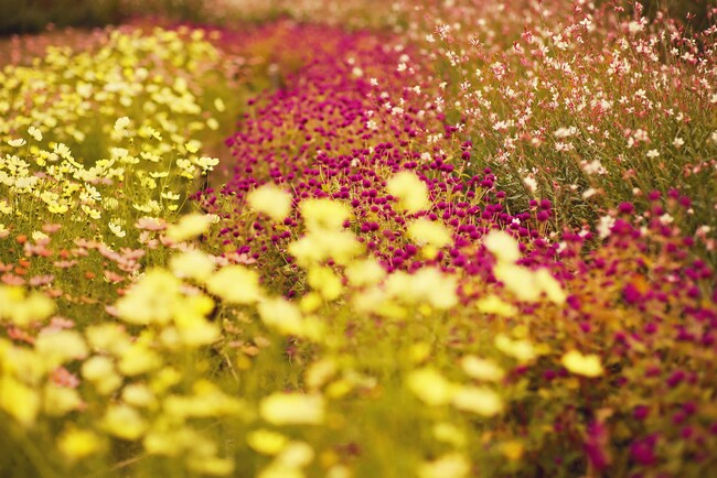昼は一面に彩る花畑が夕刻には夕焼け色の花畑へと移り変わります。