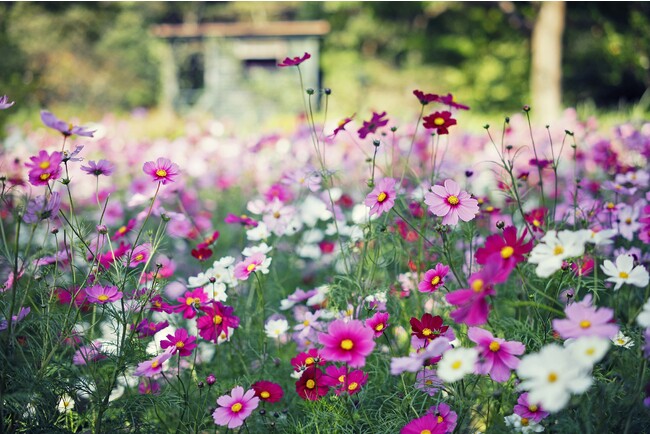 一面の花畑「風の丘フラワー園」、ハーブのある暮らしをテーマにしている「四季の庭- よろこびの庭 -」。テーマの異なる2つのコスモス畑で様々な情景をお楽しみいただけます。