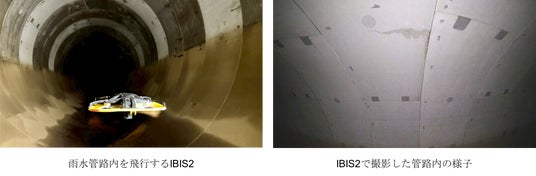 今回、点検対象となった雨水管は、5mを超える大口径管で目視では点検必要年数に至っていないため、今まで点検を実施しておらず、さらに酸欠リスクを伴う可能性がある閉鎖空間であり、作業員の安全確保を実現するには、課題が多い状況となっています。このような状況に対し、当社の「IBIS2」は約600mの直線距離にわたり飛行し、曲がり角や狭小部を含む内部映像の取得に成功しました。