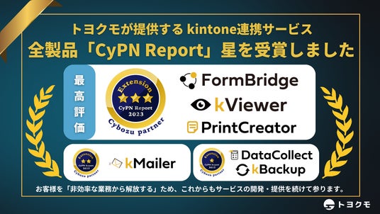 トヨクモの提供するkintone連携サービス「FormBridge」「kViewer」「PrintCreator」「kMailer」「kBackup」「DataCollect」は、6製品全てサイボウズが設定している評価基準「Cybozu Partner Network Report」にて星の評価を獲得しています。