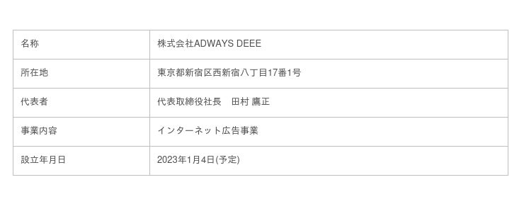 株式会社アドウェイズ(本社:東京都新宿区、代表取締役社長:山田 翔、以下アドウェイズ)は、本日開催の取締役会において、2023年1月4日を効力発生日(予定)として、当社のアドプラットフォーム事業に関する権利義務を新設分割により新設する株式会社ADWAYS DEEEに承継させることを決議いたしましたので、下記のとおりお知らせいたします。