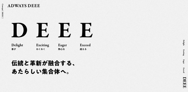 「DEEE」は、ADWAYS DEEEをカタチづくる4つの言葉の頭文字である、「Delight(喜び)」、「Exciting(わくわく)」、「Eager(熱心な)」、「Exceed(超える)」から構成されています。ADWAYS DEEEでは、ステークホルダーの想像を超えた、喜びやワクワクを生み出し、アフィリエイト広告を次の世代に進化させてまいります。