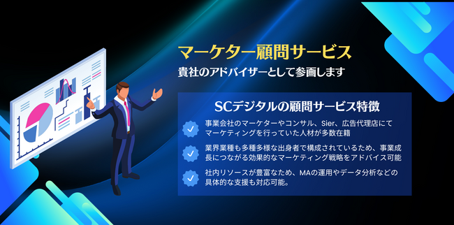 SCデジタル株式会社(東京都渋谷区、代表取締役 社長執行役員CEO:柿木 弾、以下「SCデジタル」)は、2023年12月6日(水)よりデジタルマーケティング領域で課題や悩みを抱えるマーケティング責任者や担当者向けに「マーケター顧問」を提供開始することをお知らせします。