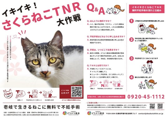 2025年4月~2026年3月の1年間にわたり、壱岐島の猫3,000頭に無料で不妊手術を行う「壱岐島TNR(ティー・エヌ・アール ※)地域集中プロジェクト」は、どうぶつ基金と壱岐市の協働事業であり、長崎県の後援も受けています。