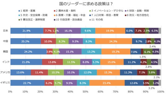 ・国のリーダーに求める政策は、各国共通して「経済・産業」、「医療・介護・福祉・年金」が上位となった。