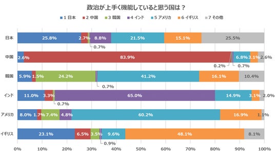 韓国を除き、「政治が上手く機能している国」として回答者の自国が上位を占めました。